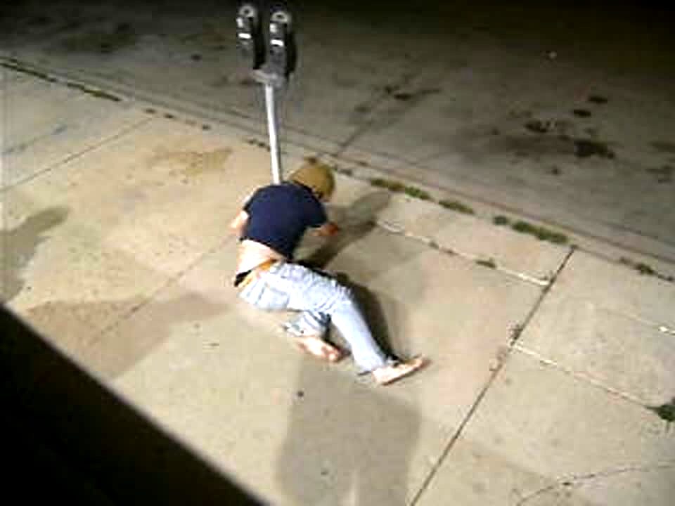 Man tries to leap frog over a parking meter. He runs and hits his groin / crotch and then flips & falls over. Bonehead.