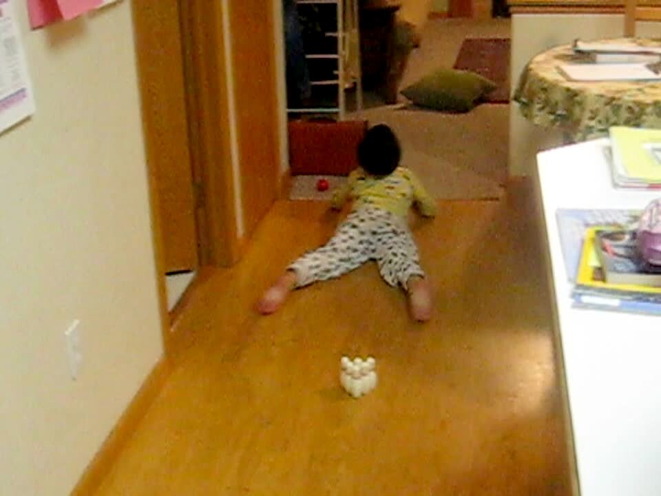 Young boy sits on the dining room floor with his legs spread open, off-camera person rolls a ball and it hits him in the groin.
