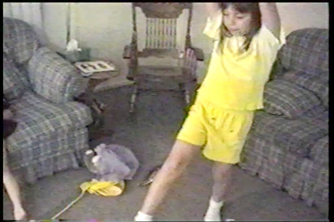 Young girl does hand stands and kicks her dad in the groin. Man falls to the floor & has good reaction. Crotch hit.