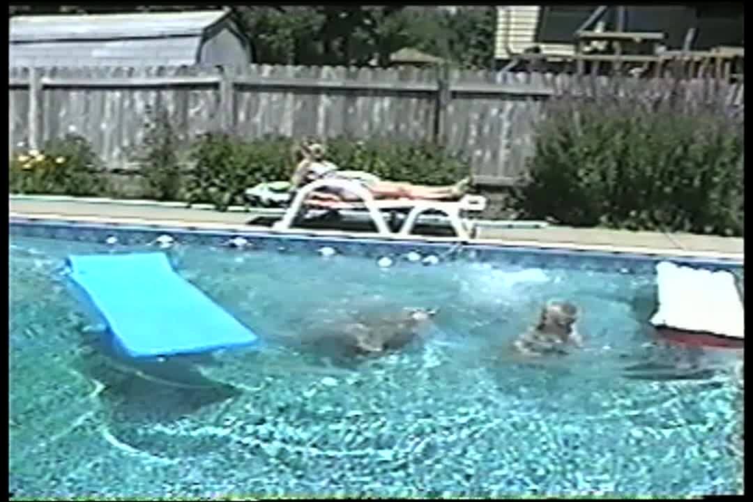 Young boy runs around pool and jumps onto man's groin / crotch who is floating on a raft in the water. Summer, swimming, surprise.