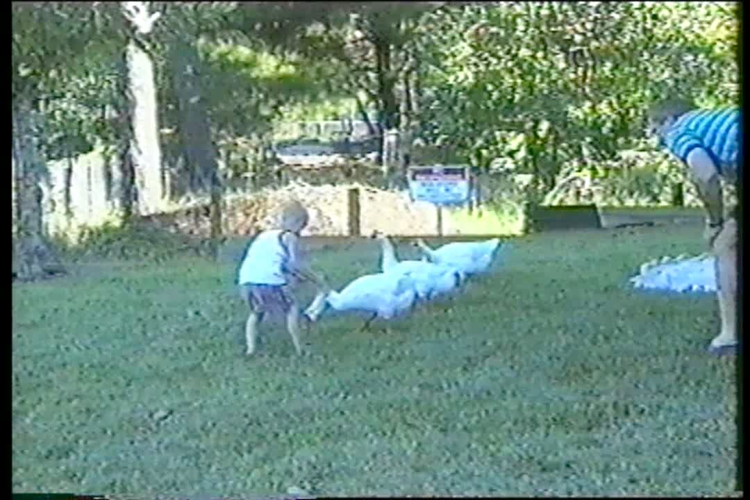 Tot boy in yard with geese; goose goes after him, pecks him in groin / crotch