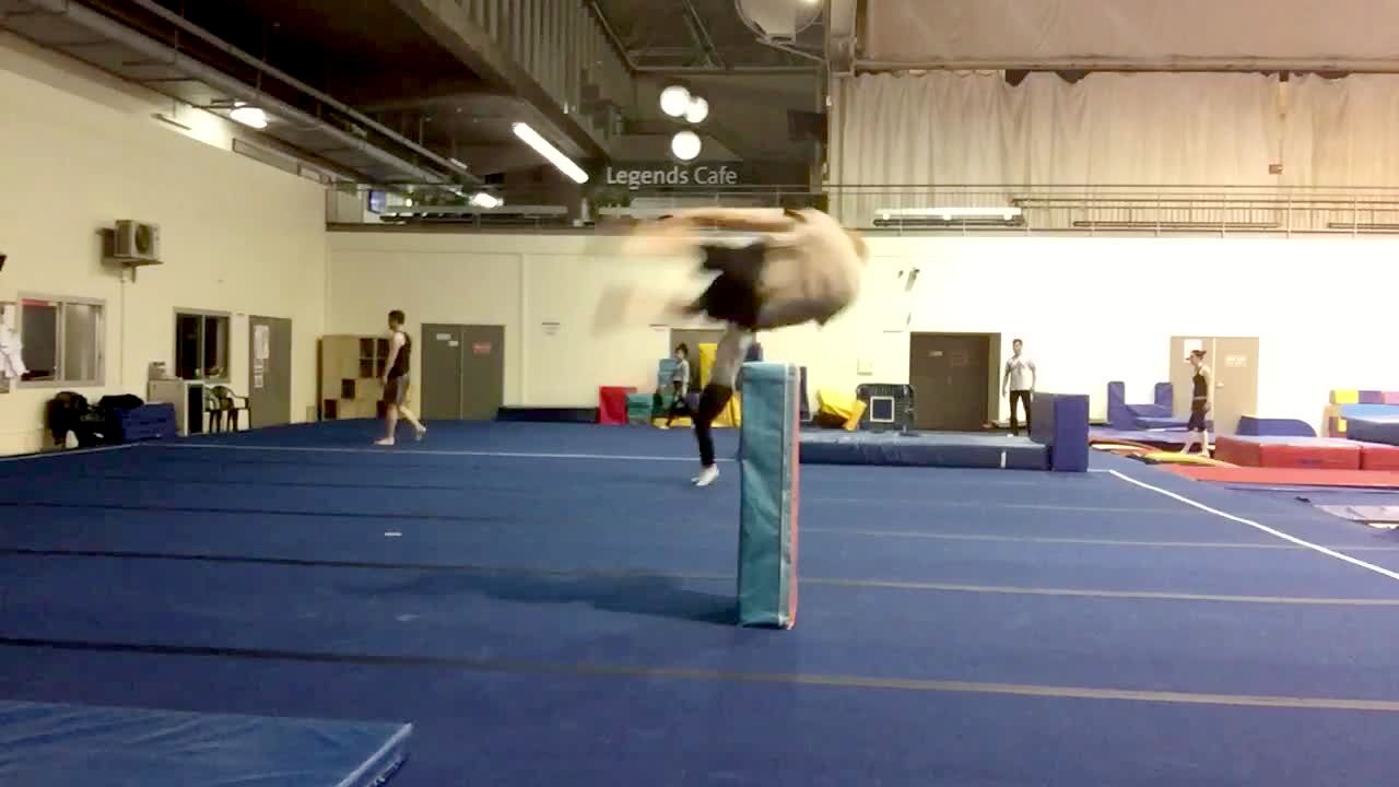 A man flips over a block in a gym successfully but when he does it again, his head hits the block and knocks it over and he falls down on the block.
