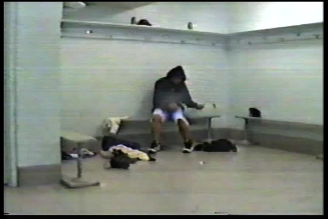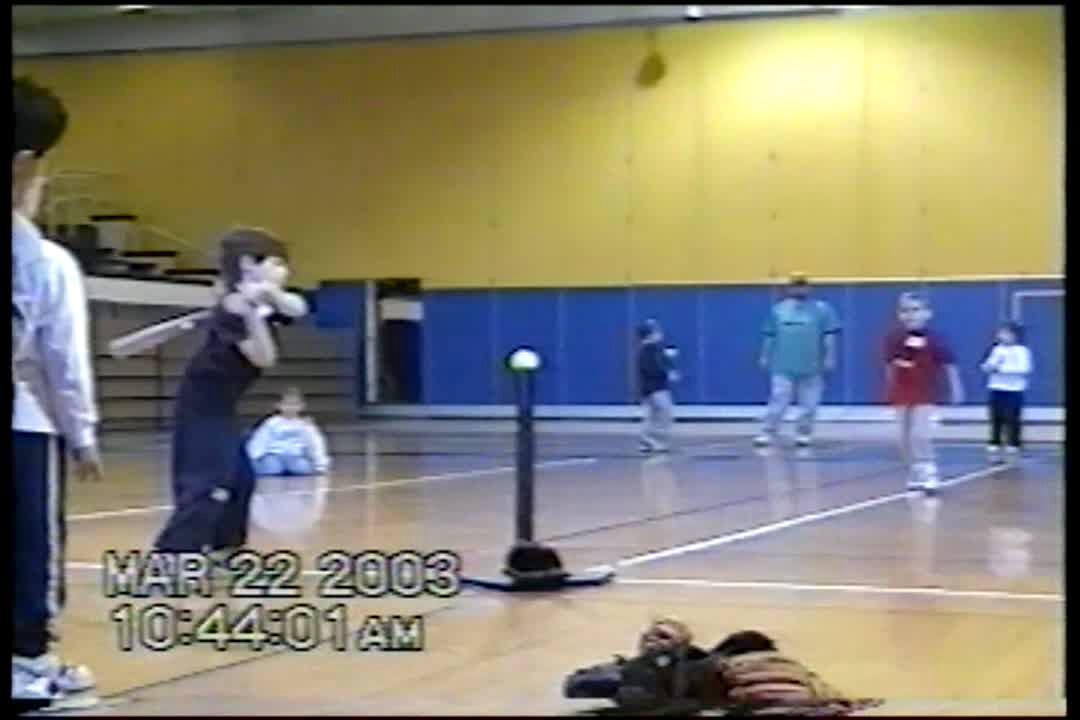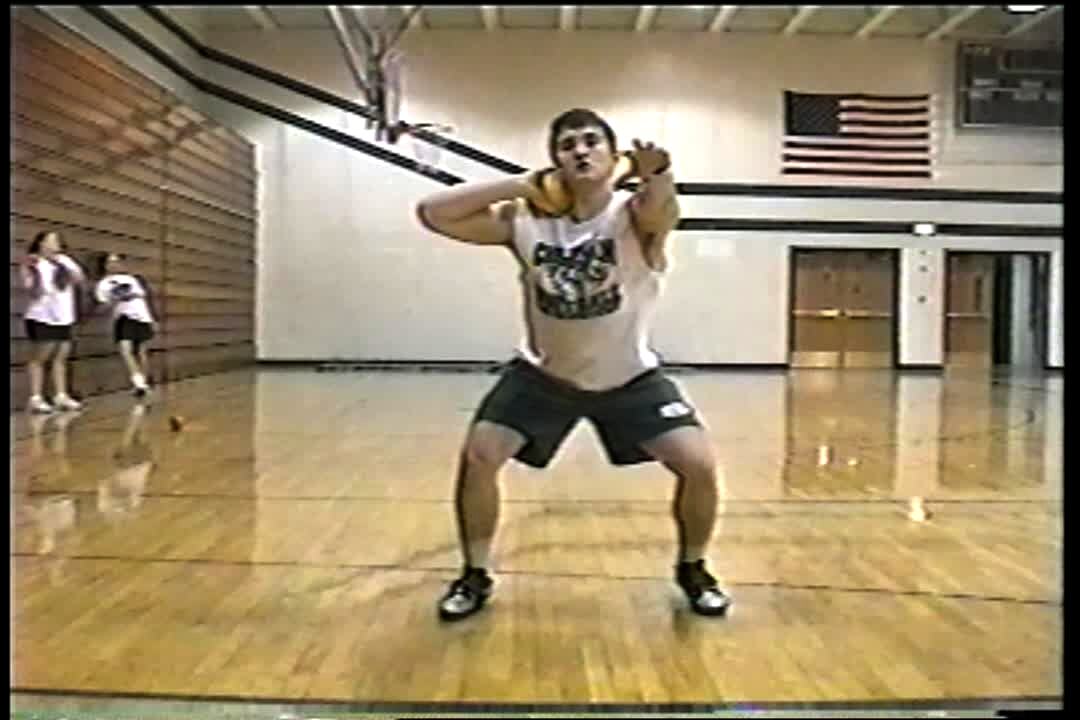 Teen boy throws shot put in high school gym, makes a basket in the net behind his back. Amazing.