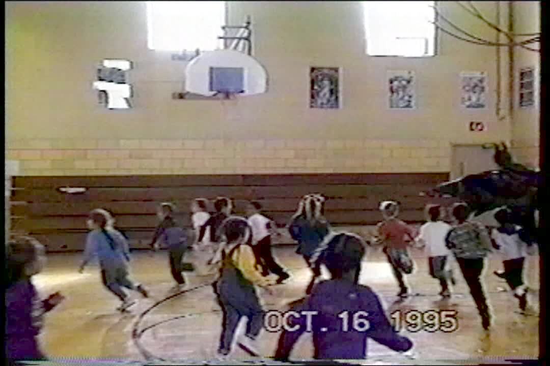 A teen girl standing on a balance beam in a school gymnasium jumps off to grab the rim of a basketball hoop only for her hands to slip on the rim, causing her her to fall to the floor.