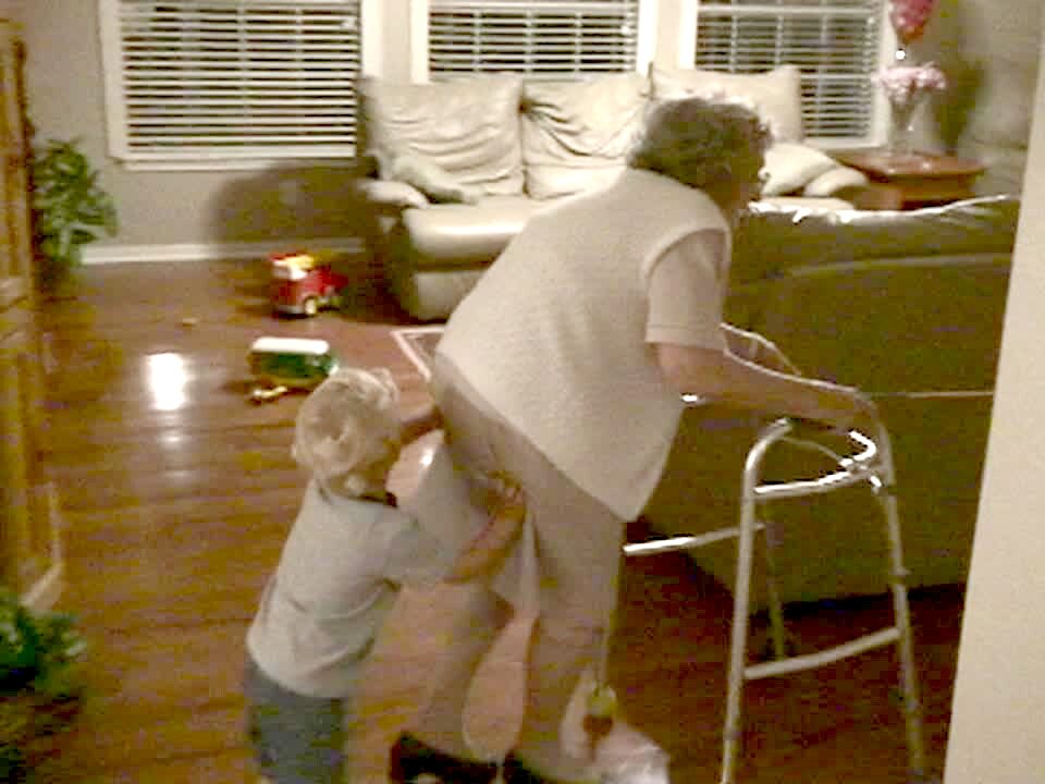 Grandma walks around the house with her walker. Tot boy pushes her butt to help her & girl pulls the walker with a leash. Boy slips on the floor & pulls senior woman's pants down.