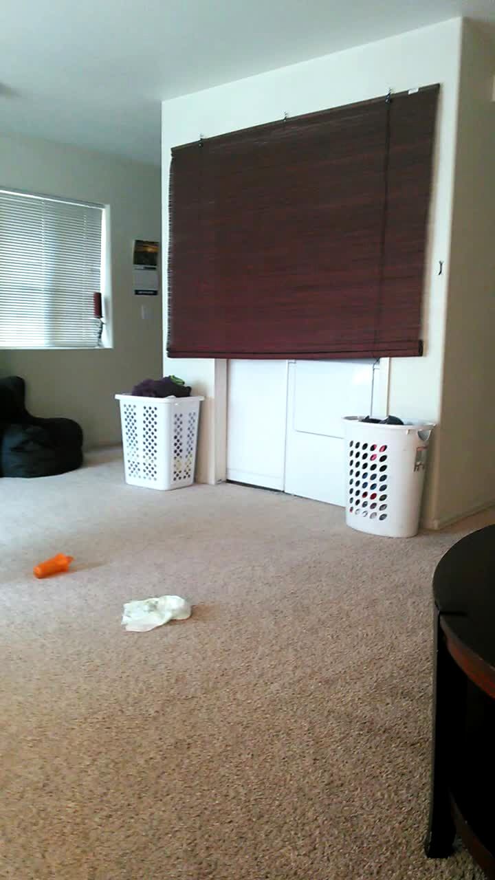 A woman throws a ball to a Labrador dog, then she hides underneath a blanket on a living room floor. The dog retrieves the ball and looks for the woman, then she talks to it and it finds her. The Disappearing Human Trick