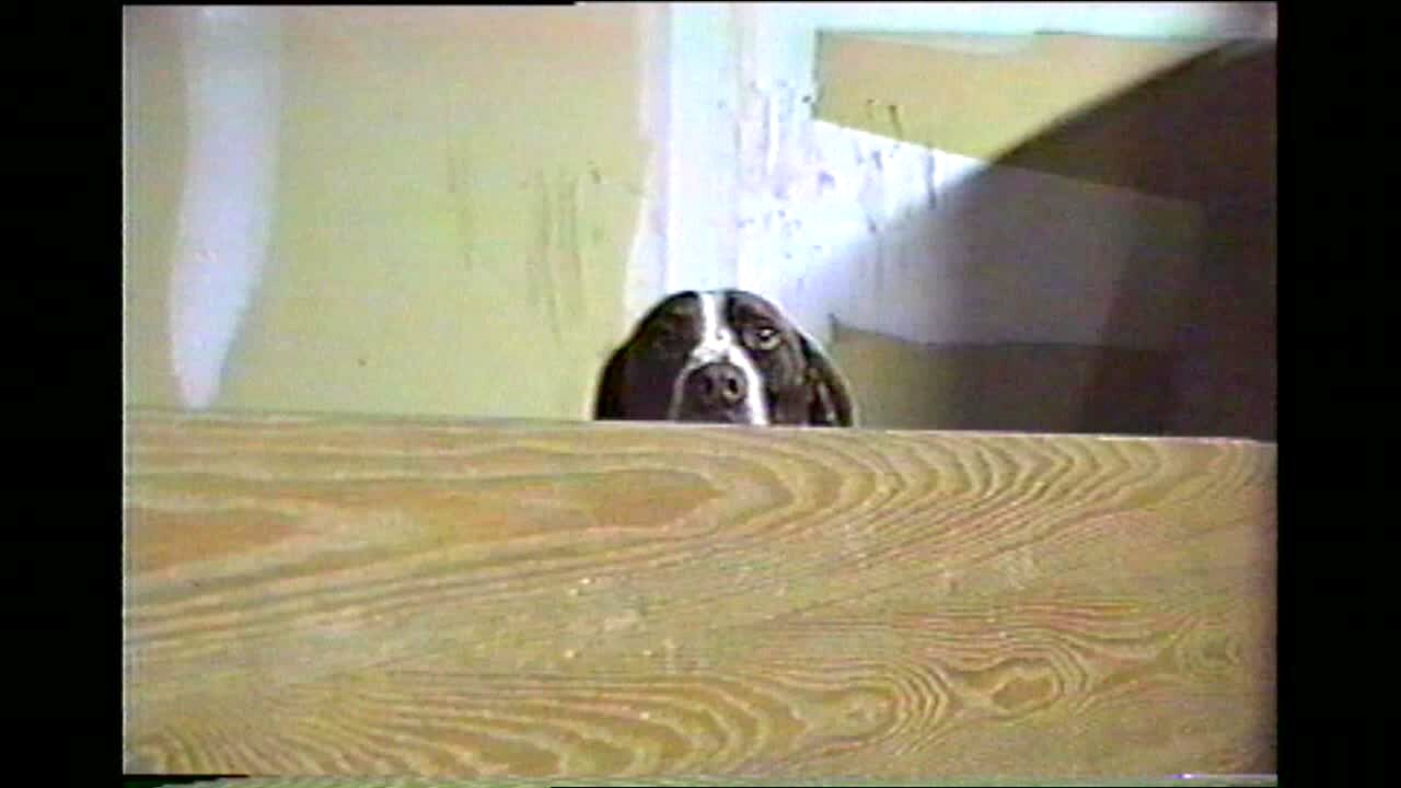 A Labrador dog runs around the hallway and looks inside rooms for a woman after she runs when she drops a blanket for the What the Fluff challenge.