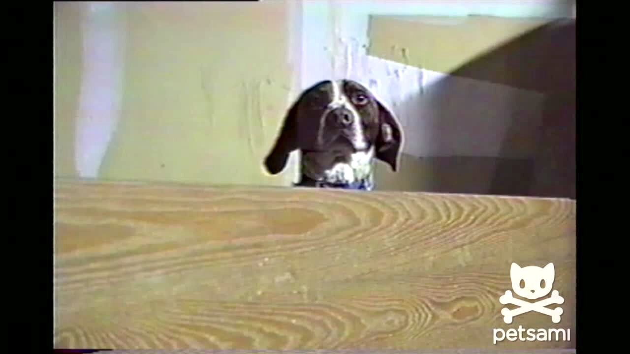 A beagle dog runs away and crawls under a house outdoors when his owner asks if he wants to take a bath.