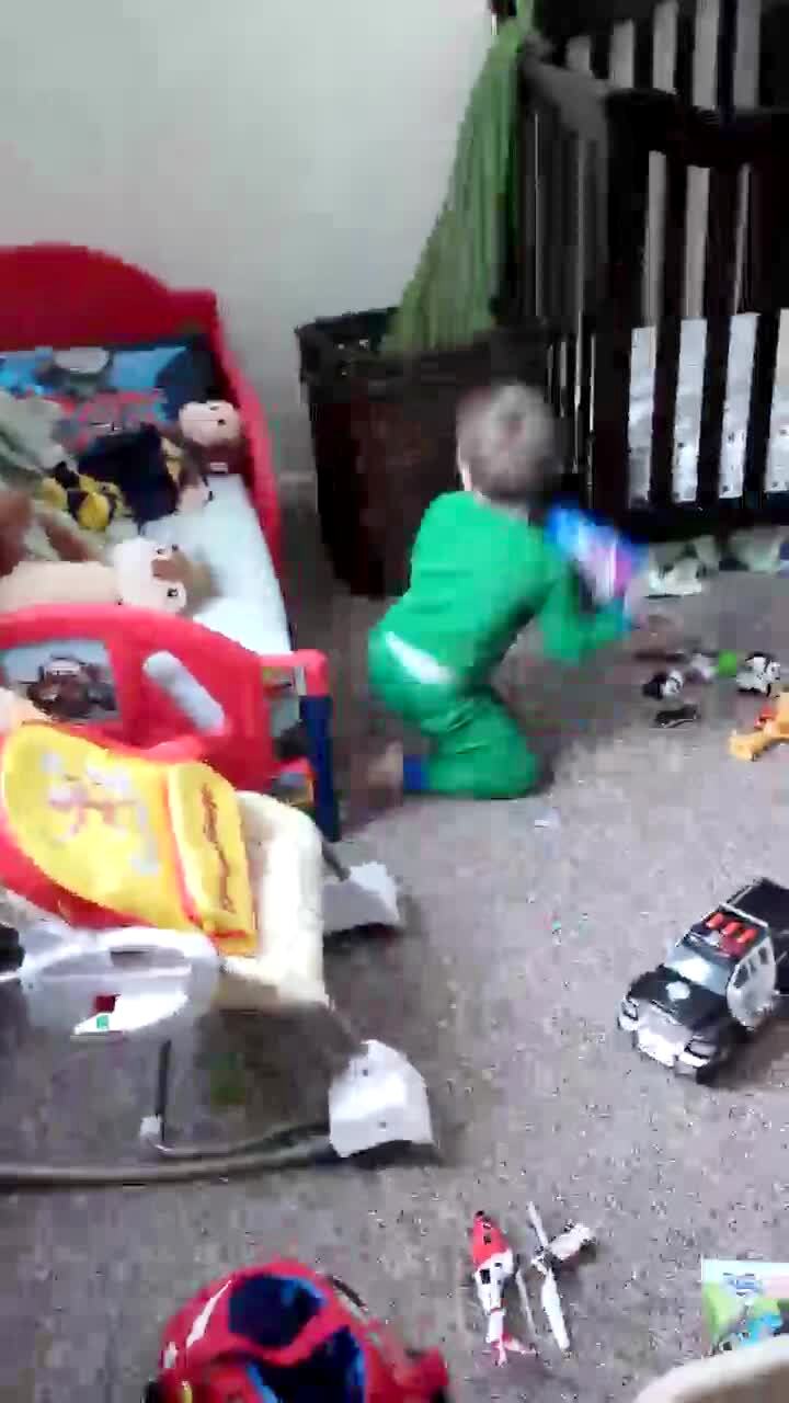 A tot boy eats cookies on the floor of his room at home. When someone walks into the room he quickly gets up and puts the cookies underneath of his bed covers.