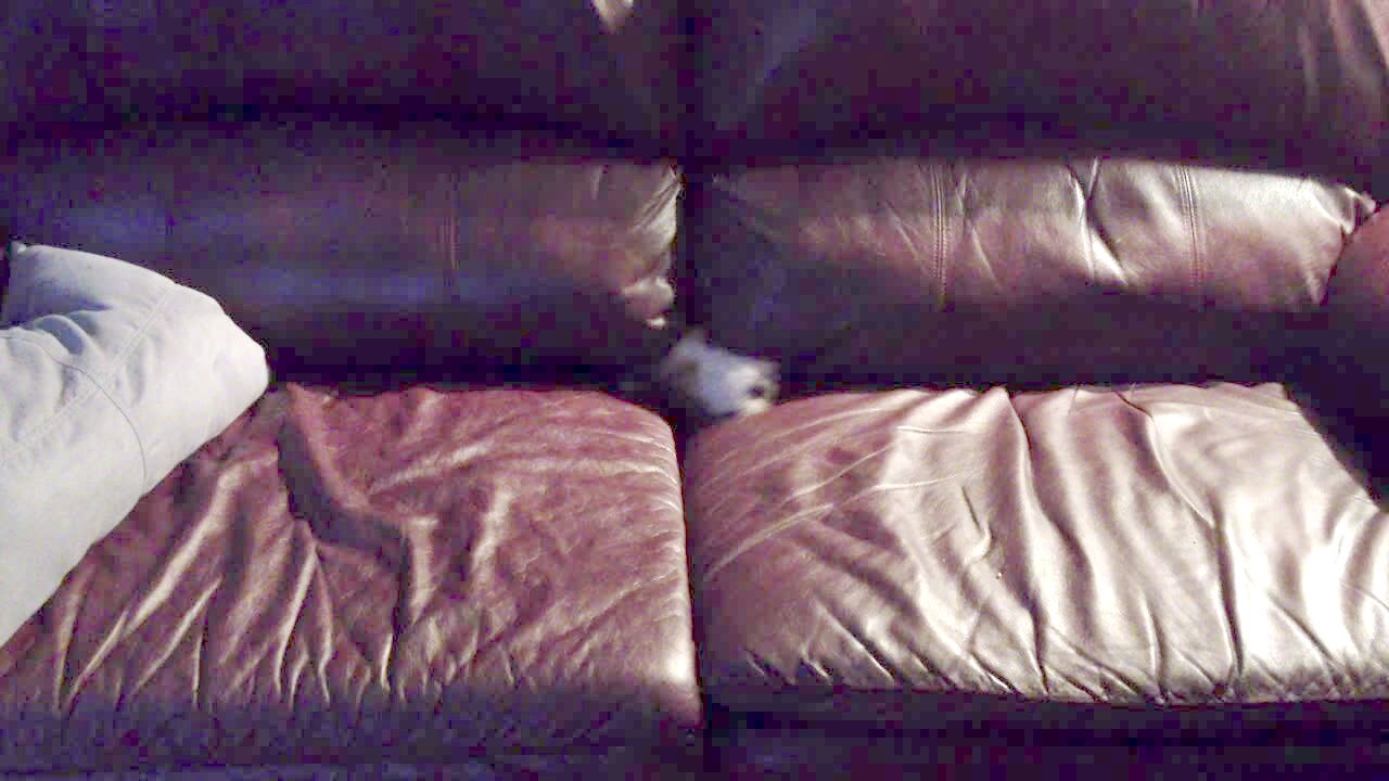 A dog crawls out from under the cushions of a leather sofa as the woman behind the camera coaxes her out.