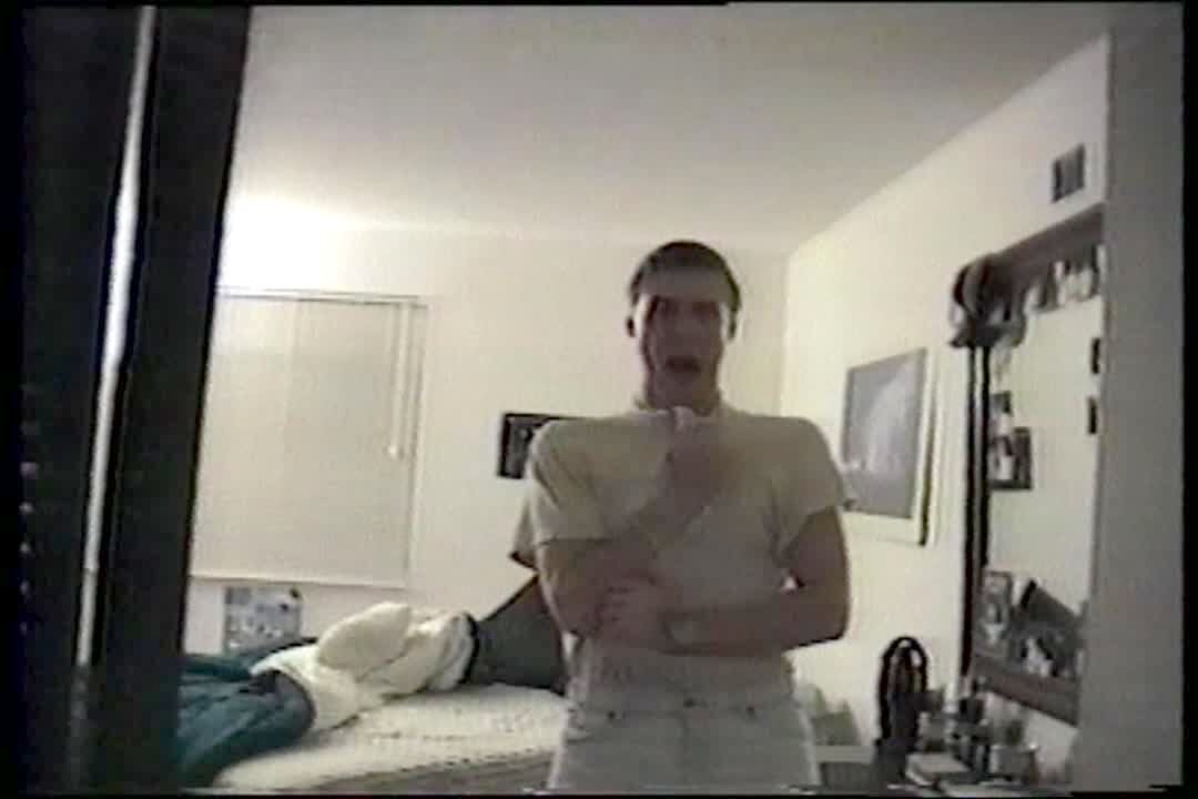 Man hides behind front door with Spider Man costume on & jumps out at woman when she walks in. Woman screams & hits man. Practical joke.