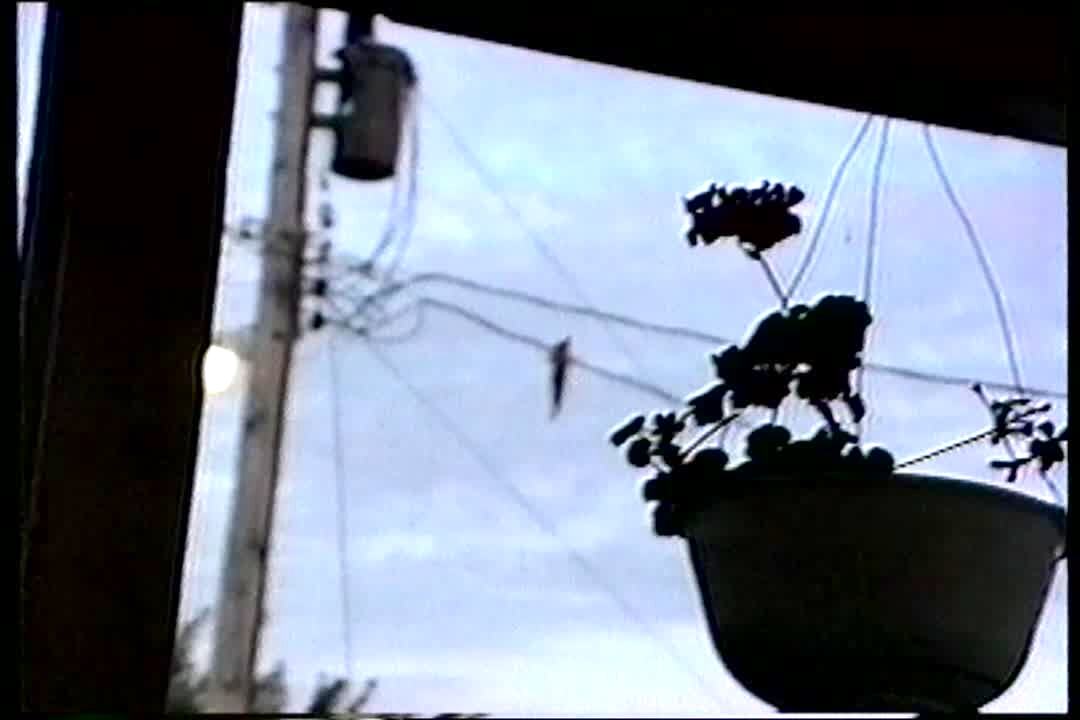 An adult man falls off a very high ladder as it collapses in a front yard. Security footage.