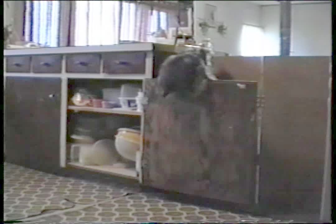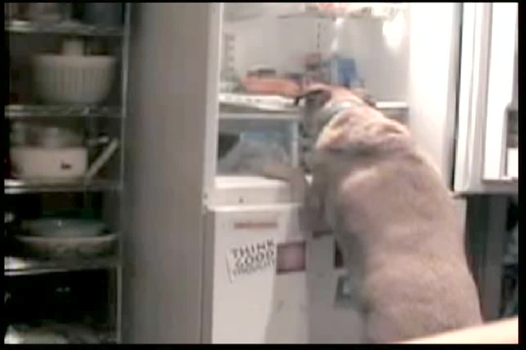 "Cold-Blooded Canine" Big dog opens refrigerator door & takes out food, then pulls out an entire shelf, leaving the fridge almost empty. Destroys fridge. Hidden camera. Blurry camera. Long for edit. Needs pull ups