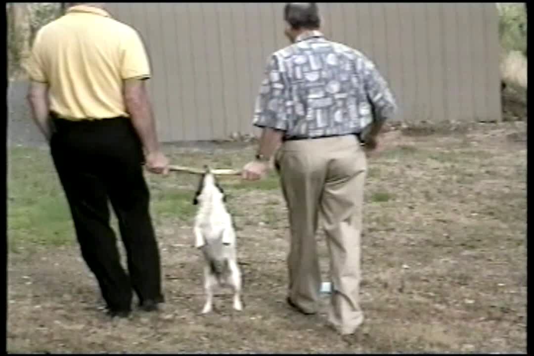 Dog holds and bites a stick that 2 men carry. *not much audio