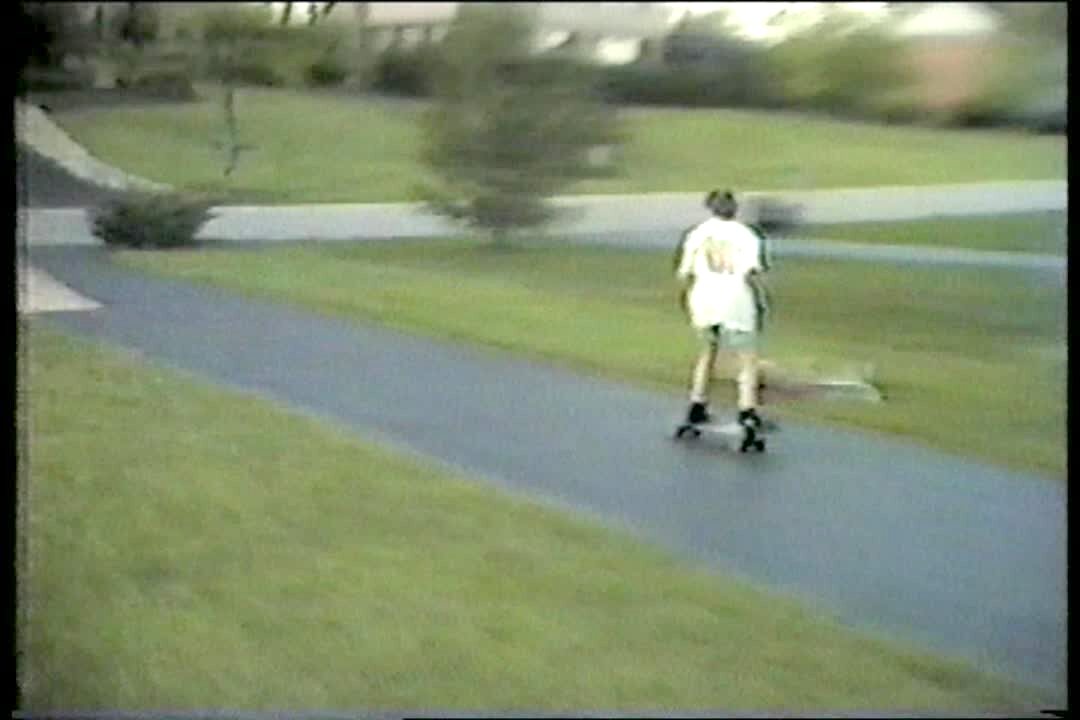 Man rides a small motorbike wearing a horned Viking helmet. He rides over a jump & crashes into a computer monitor laying in the grass. Stunt, boneheads.