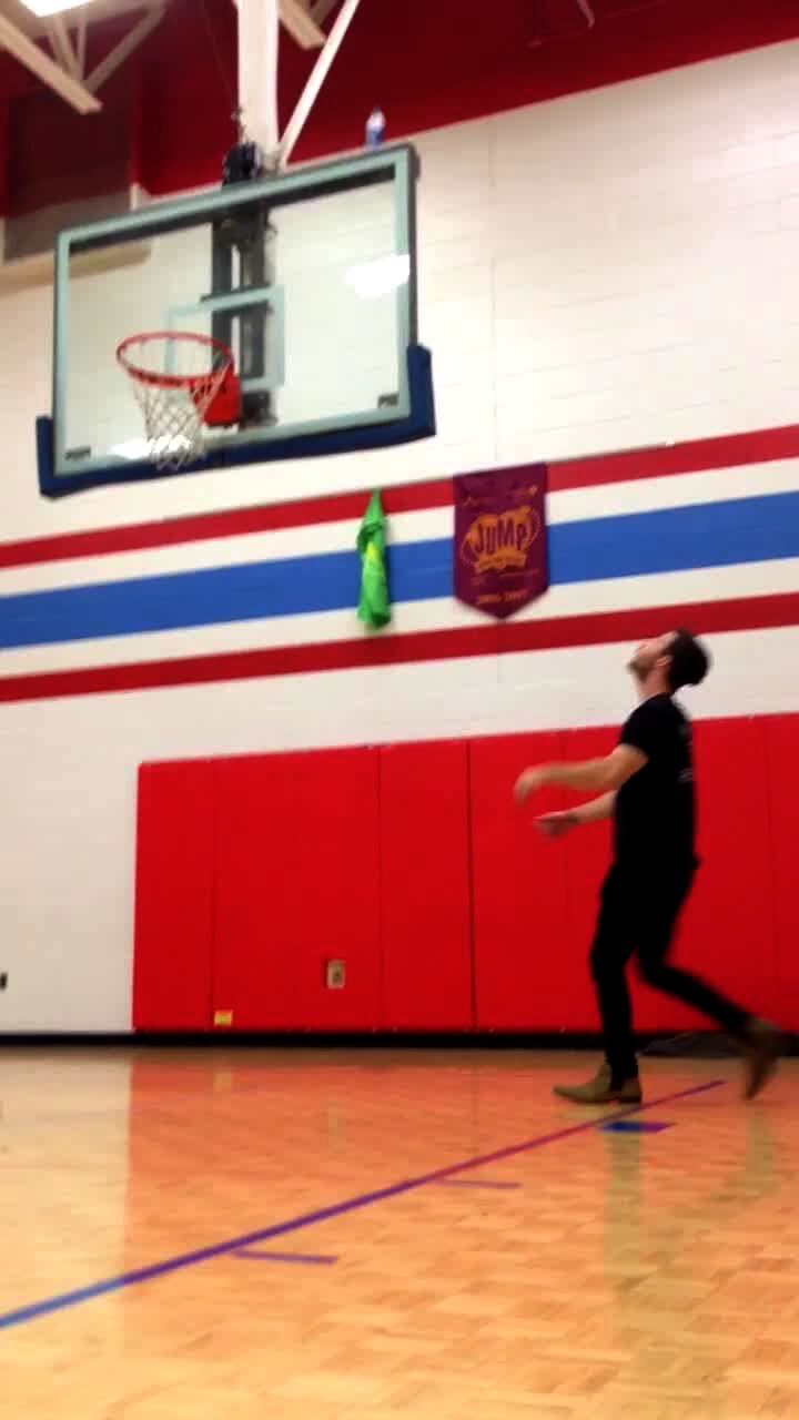A young man flips a water bottle on top of a backboard on a basketball court. AA: bottle flipping.