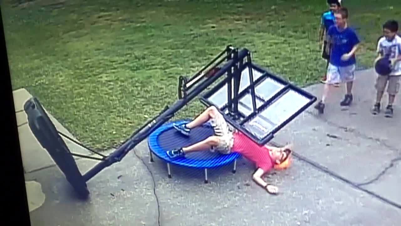Surveillance footage shows kids playing with a trampoline and a basketball hoop outdoors and the hoop falls.