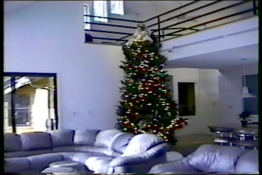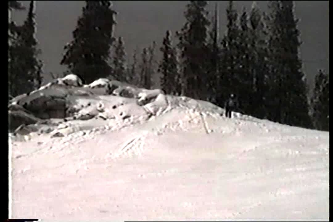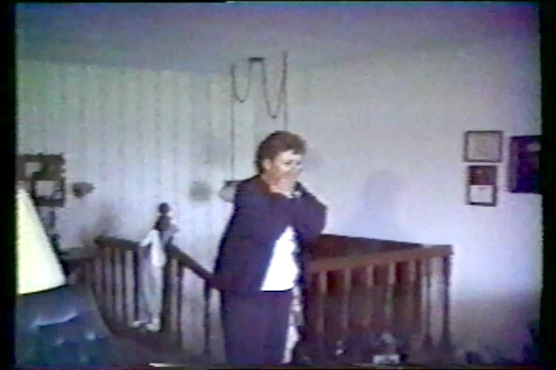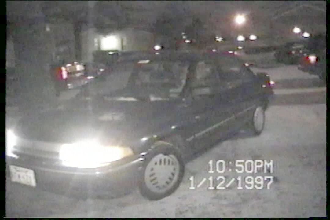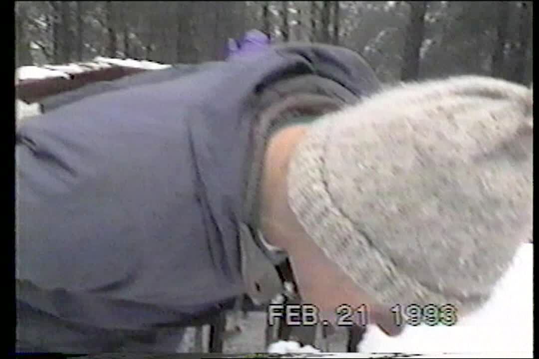 Woman who can't park car gets out and trips in snow. She's angry. Date on screen 1997.