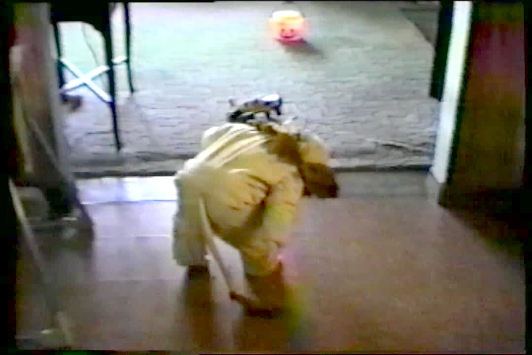 A woman carries a box down the path and falls, while the contents of the box flies in the front yard. Security footage.