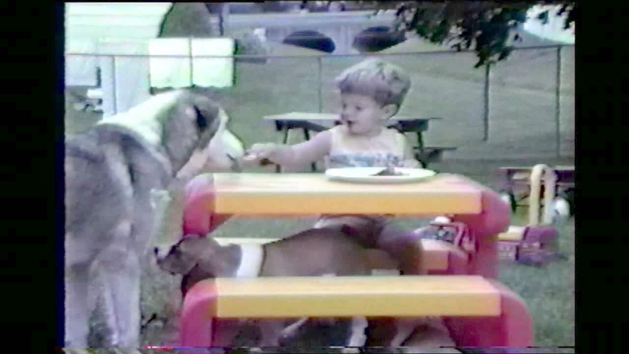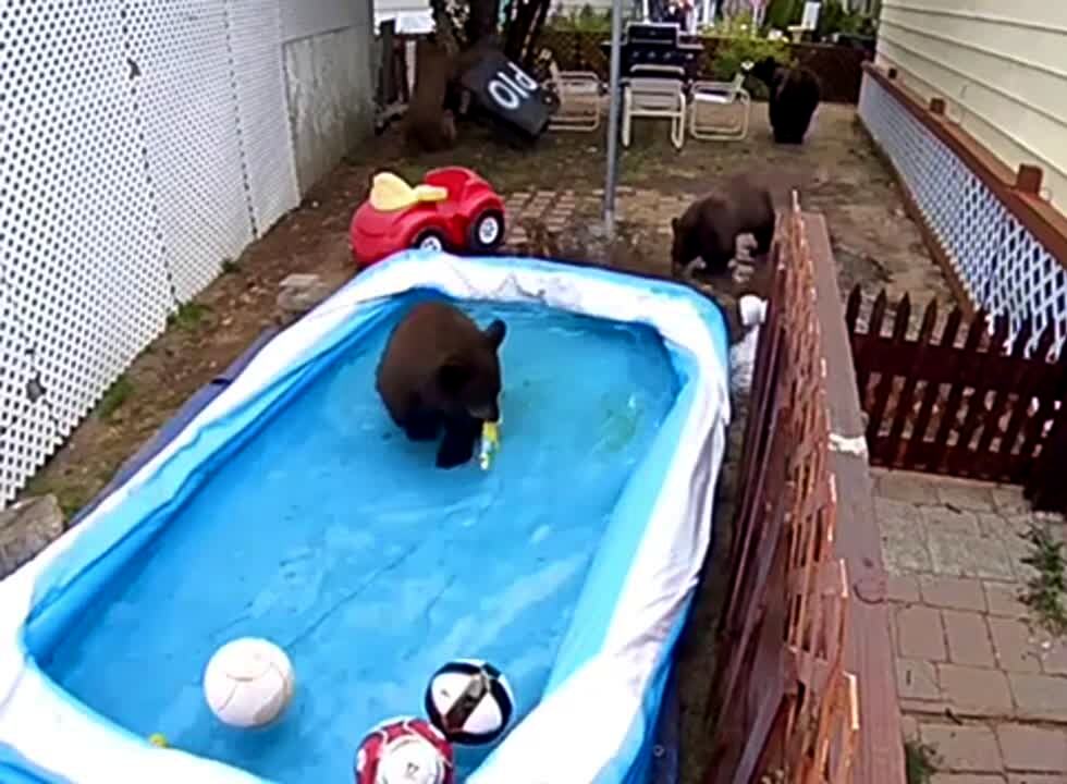 Two bears play with toys inside of an inflatable pool in the yard while another bear knocks over a trash can. Security footage.