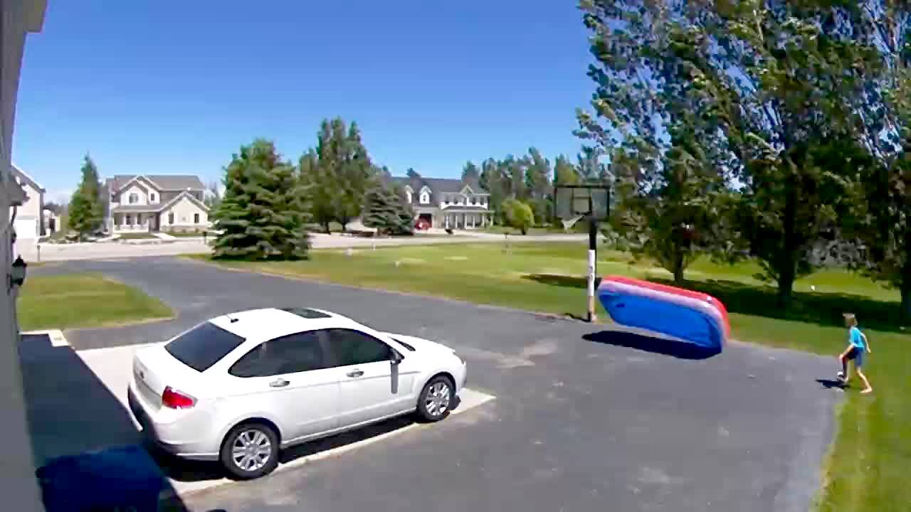 A young girl tries to carry an inflatable pool out of the garage but the wind catches it and blows her backwards and it flies down the driveway and she chases after it. Security footage.