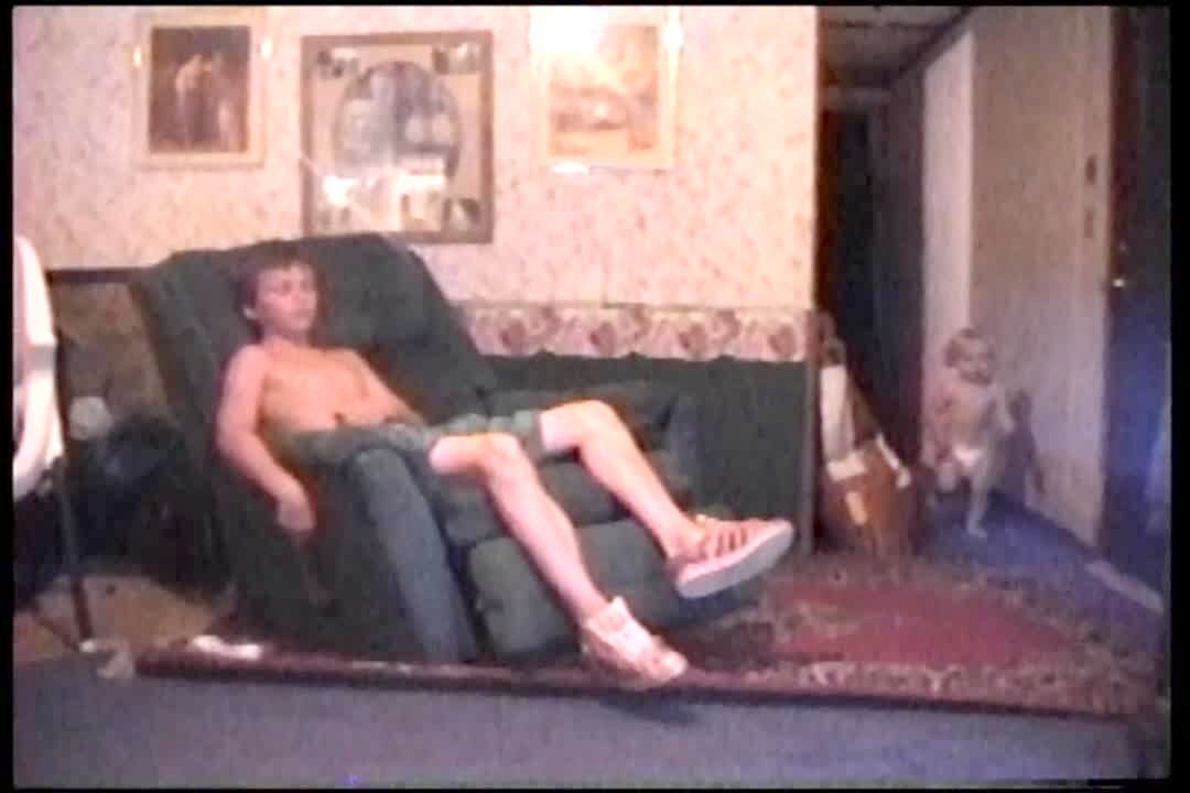 Boy trying to watch TV on a lazy boy, is frustrated by boys running around in front of him, so he lifts the leg rest up and it trips one of the boys.