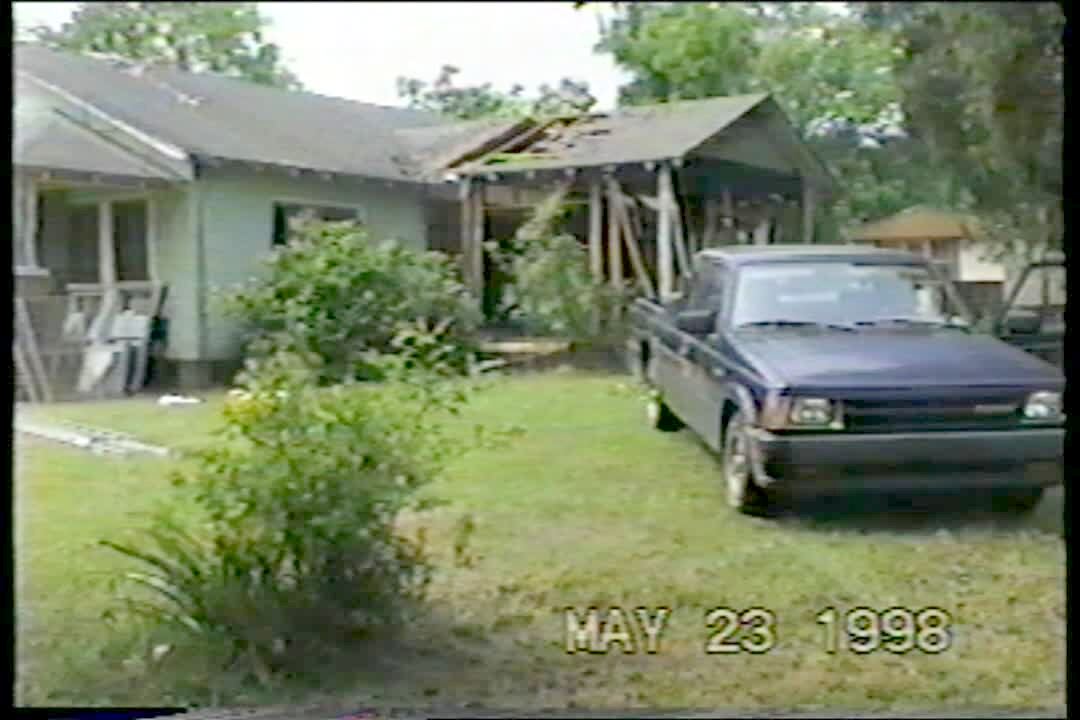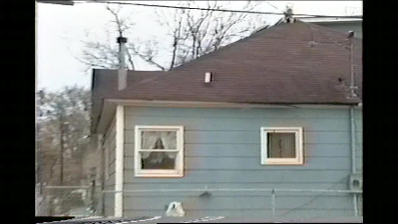 Pick up truck is tied to an old house to help demolish it. Instead a single piece of wood is ripped off house and hits the truck with a thud sound. Boneheads.