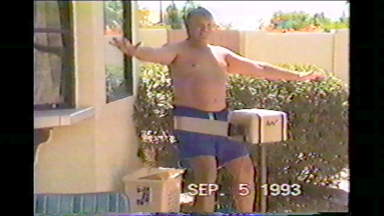 Man using exercise vibrator falls backward when strap breaks.