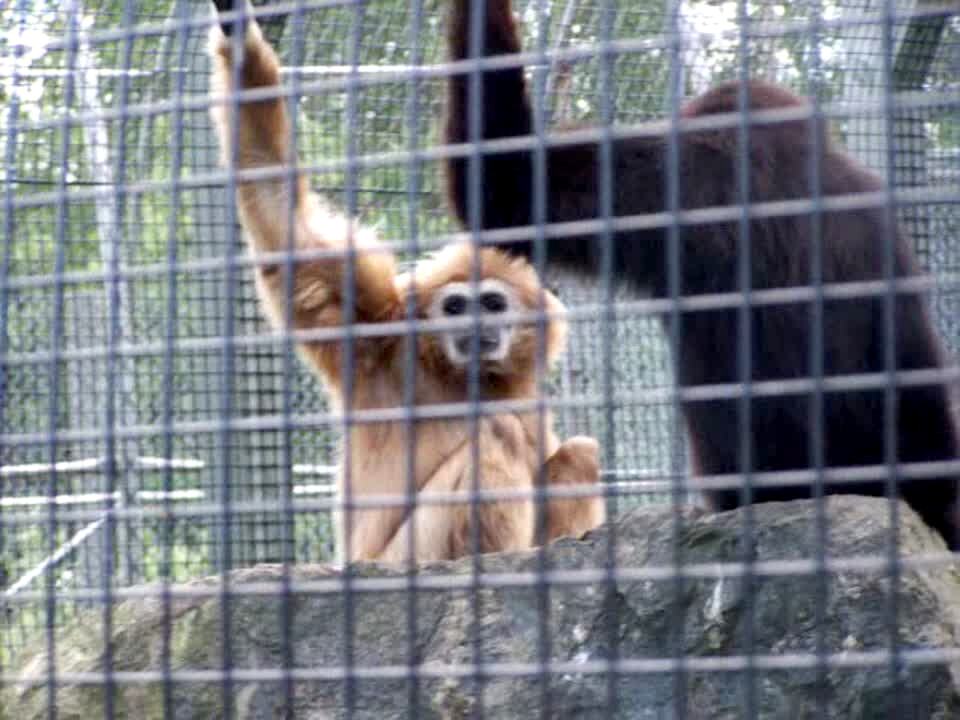 Two gibbon monkeys in a zoo hoot and howl at each other outdoors. One monkey jumps up and puts its butt in the others face to stop it.