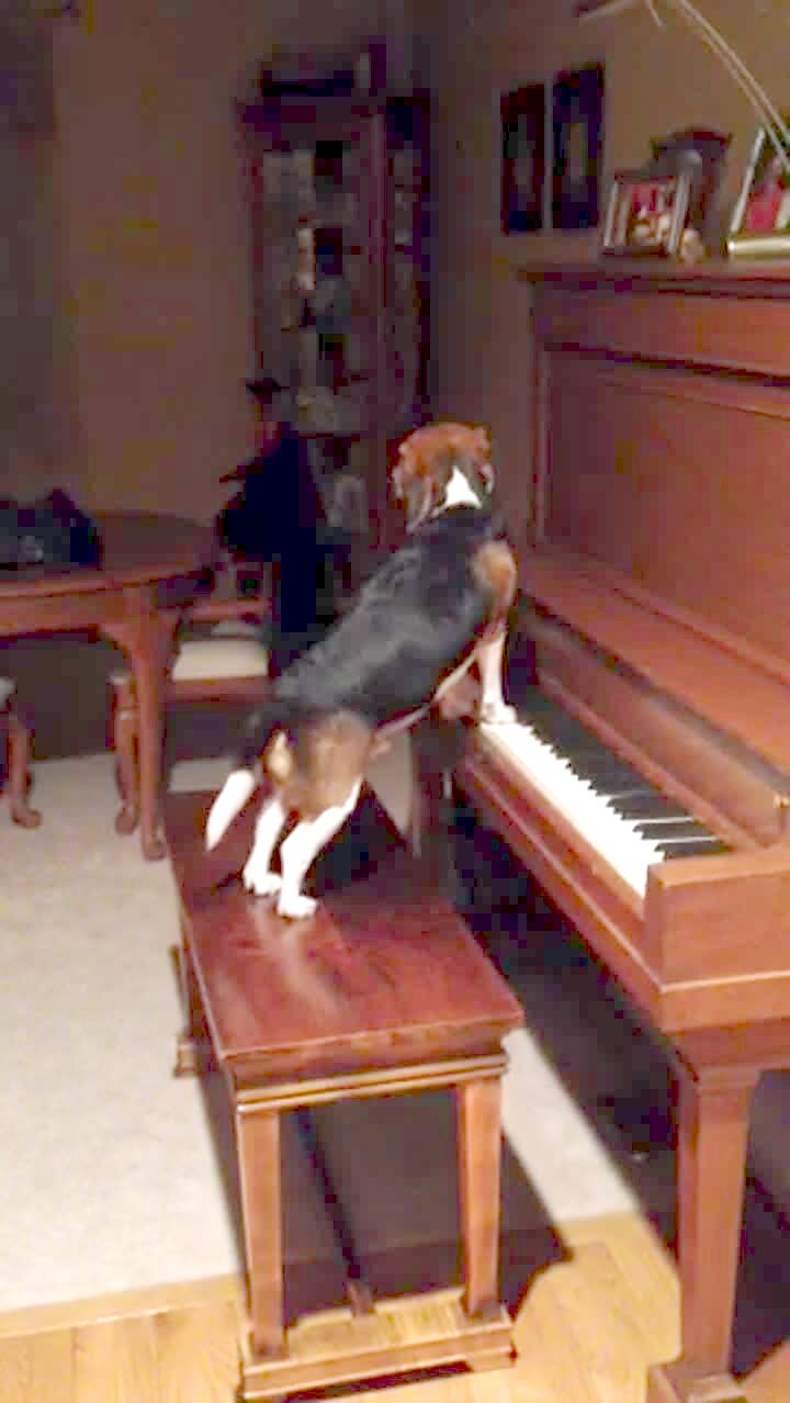 A Yorkshire Terrier dog howls along as a senior woman sings and plays piano indoors.
