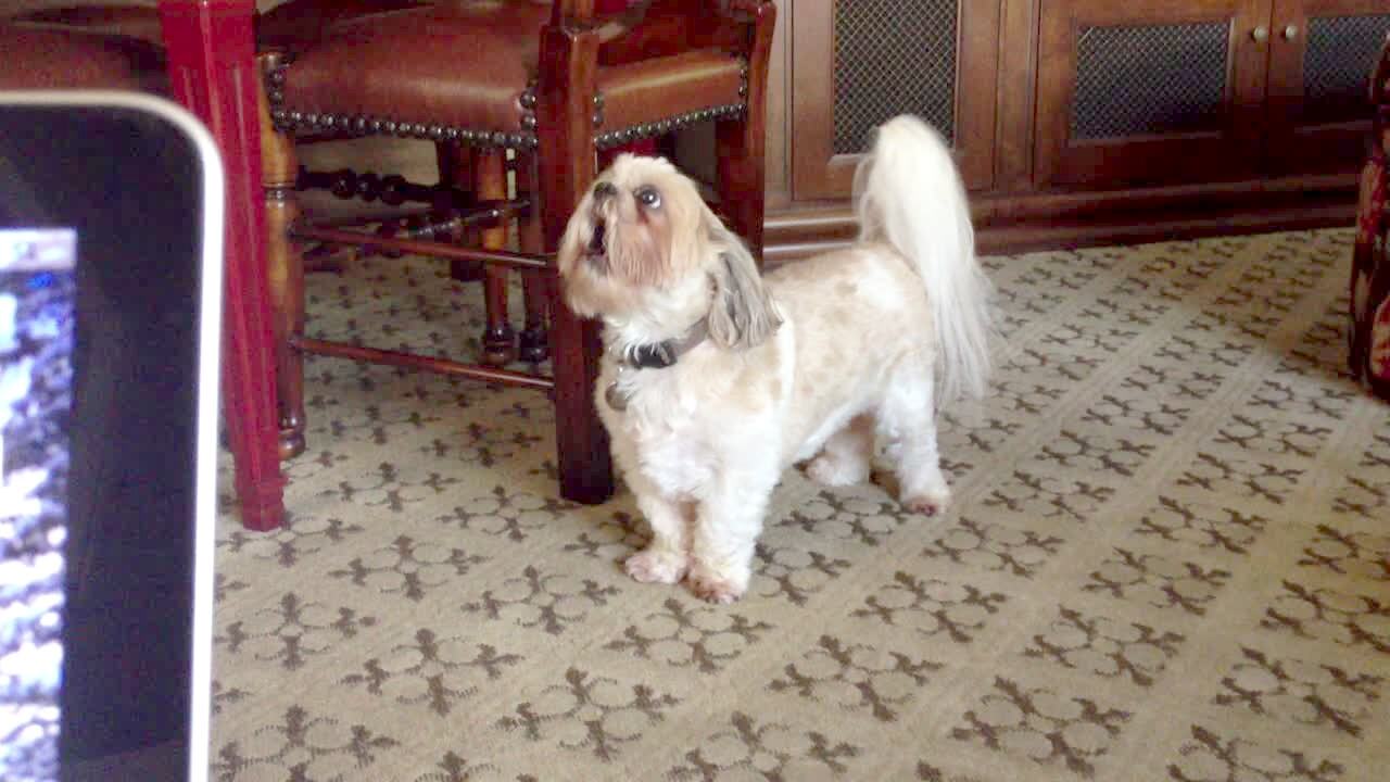 A pitbull dog tries to say 'I love you' to the camera on command.