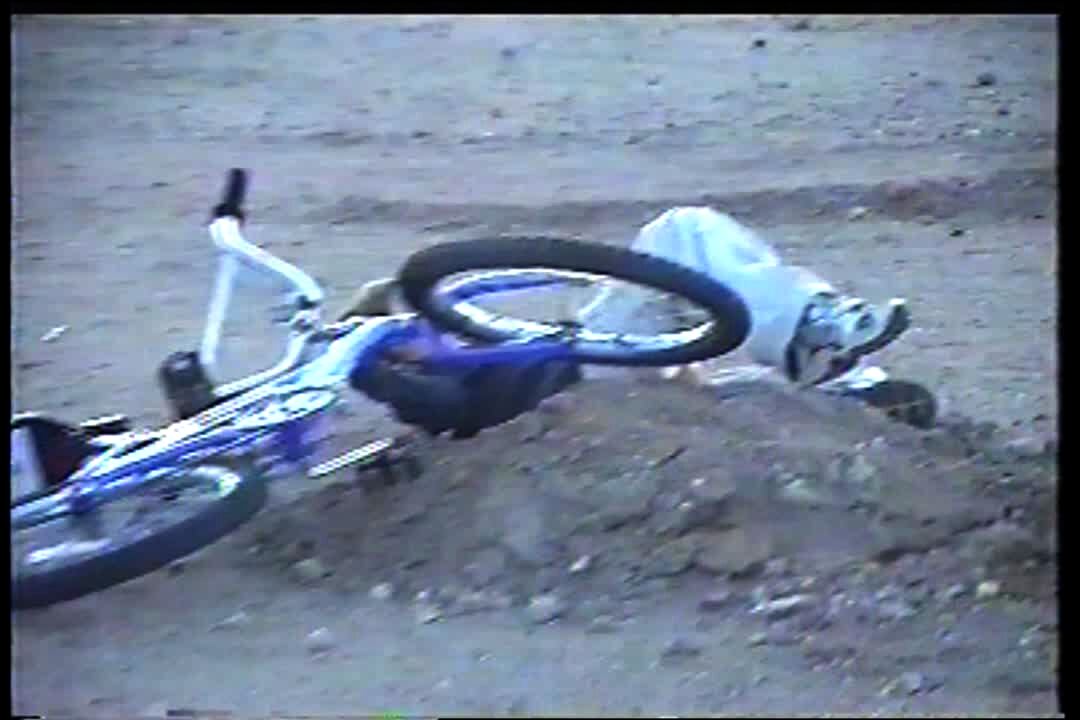 Boy rides his bike and tries to go over a jump. He falls forward onto his groin before hitting the ground. He screams. Crotch.