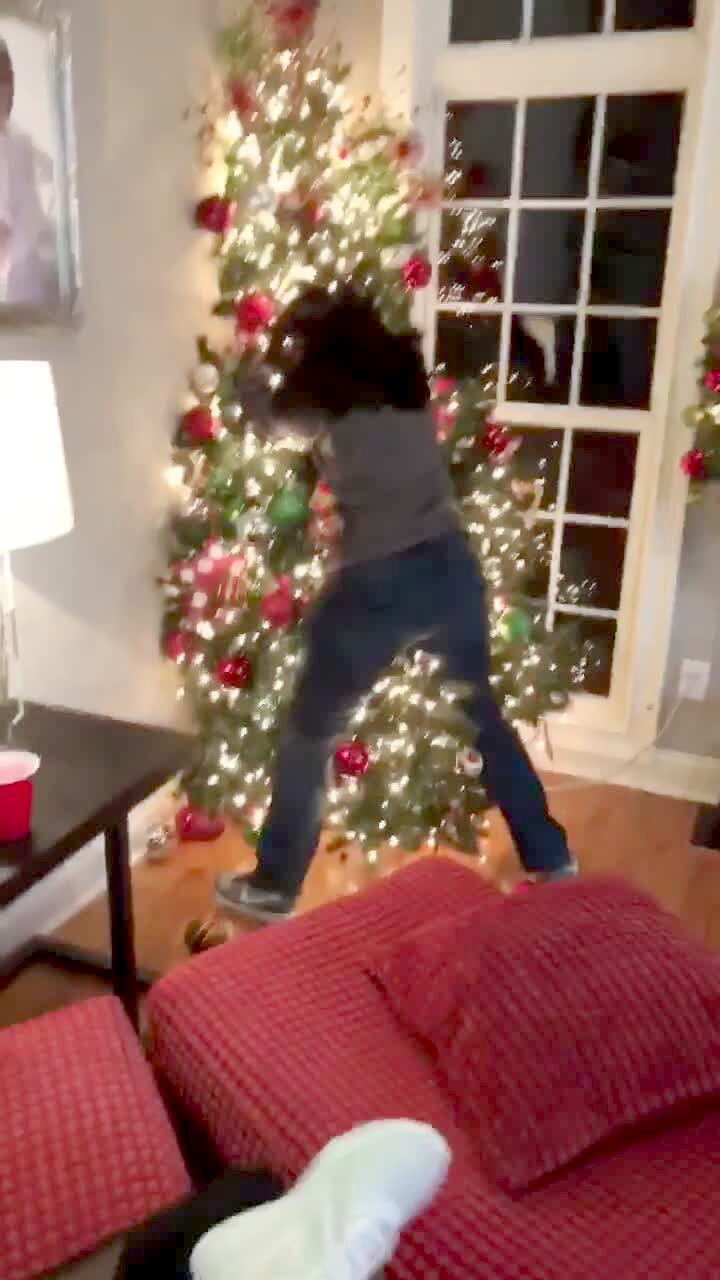 A woman jumps on her Christmas tree and hugs it while her family cheers to celebrate a football game. She shakes the tree and ornaments fall off and break on the floor.