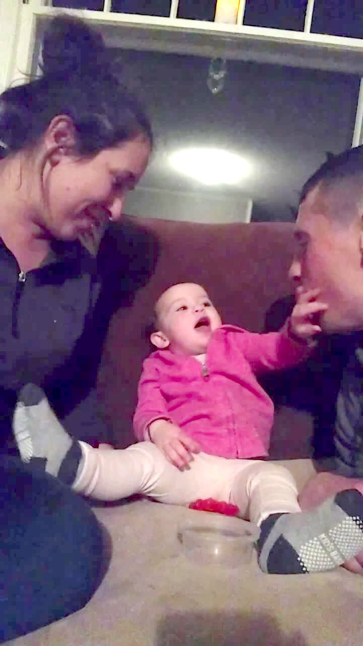 A woman walks down a driveway where a man sleeps in a car with the door open, then she yells his name, and he falls out of the car.