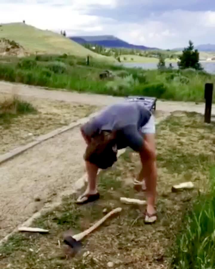 A woman chops a piece of wood. It bounces up and hits her in the crotch.