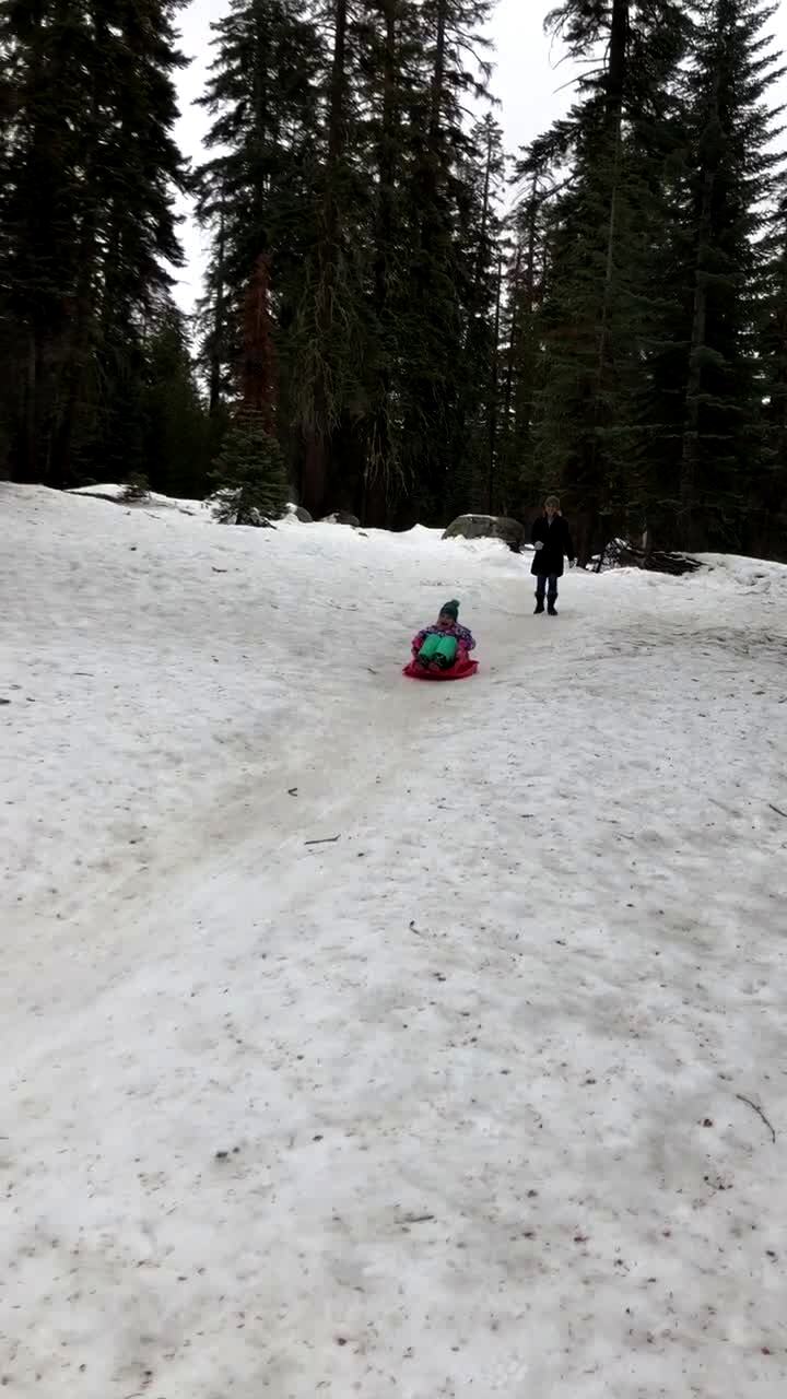A man slips and falls in the winter snow while he chases after his young granddaughter when she continues to sled down a hill after he stops her.