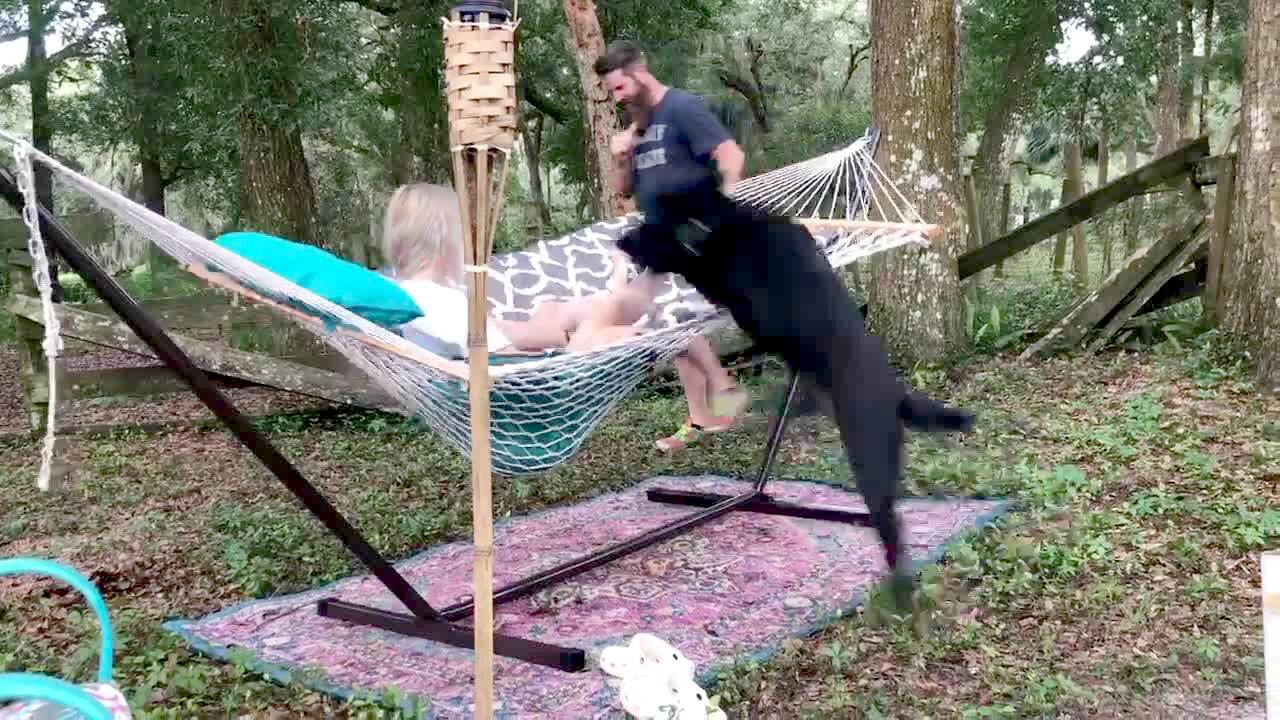 A man hits at a pi̱ata in the backyard, and punches the man who helps him in the face.