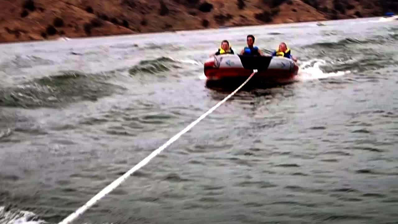 Three teen boys ride on a large float behind a boat. Two of the boys are flung off the float into the water when the boat takes a sharp turn.