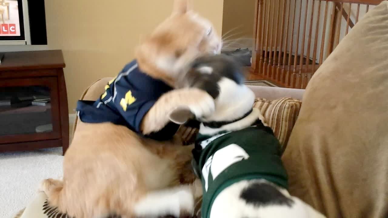 An orange cat in a sport's jersey falls off of a sofa while wrestling with a terrier dog in another jersey at home.