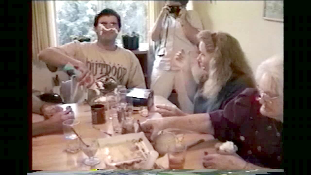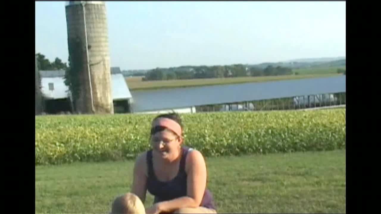 Tot boy falls backwards on plastic patio chair while eating ice cream sandwich. Woman stuffs her face with ice cream.
