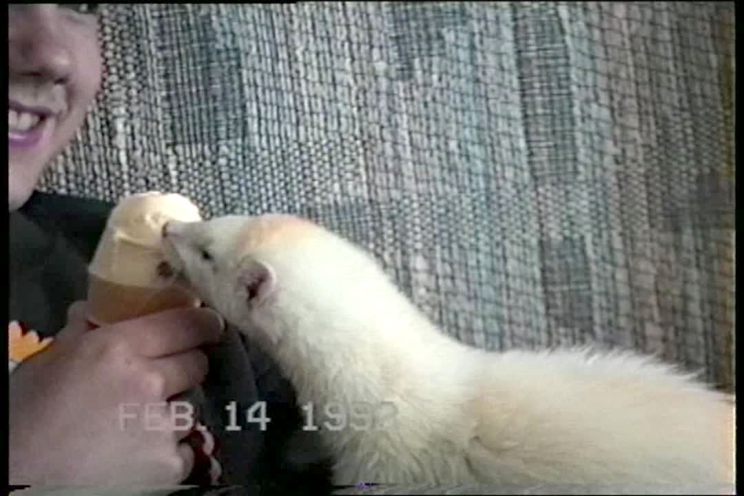 A dog with an absurdly long tongue tries to eat ice cream indoors. He has "hanging tongue syndrome".