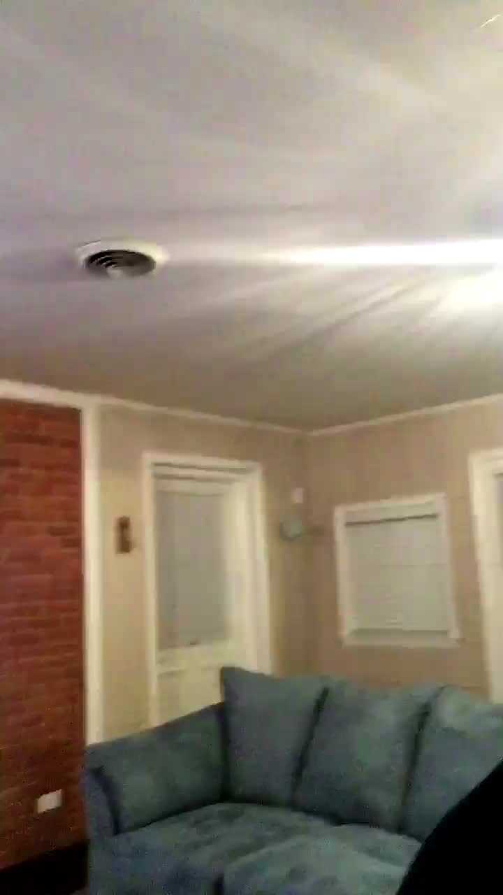 A woman sets up a camera to try and scare someone in a living room but she steps off of the couch and wipes out onto the ottoman. Social media video.