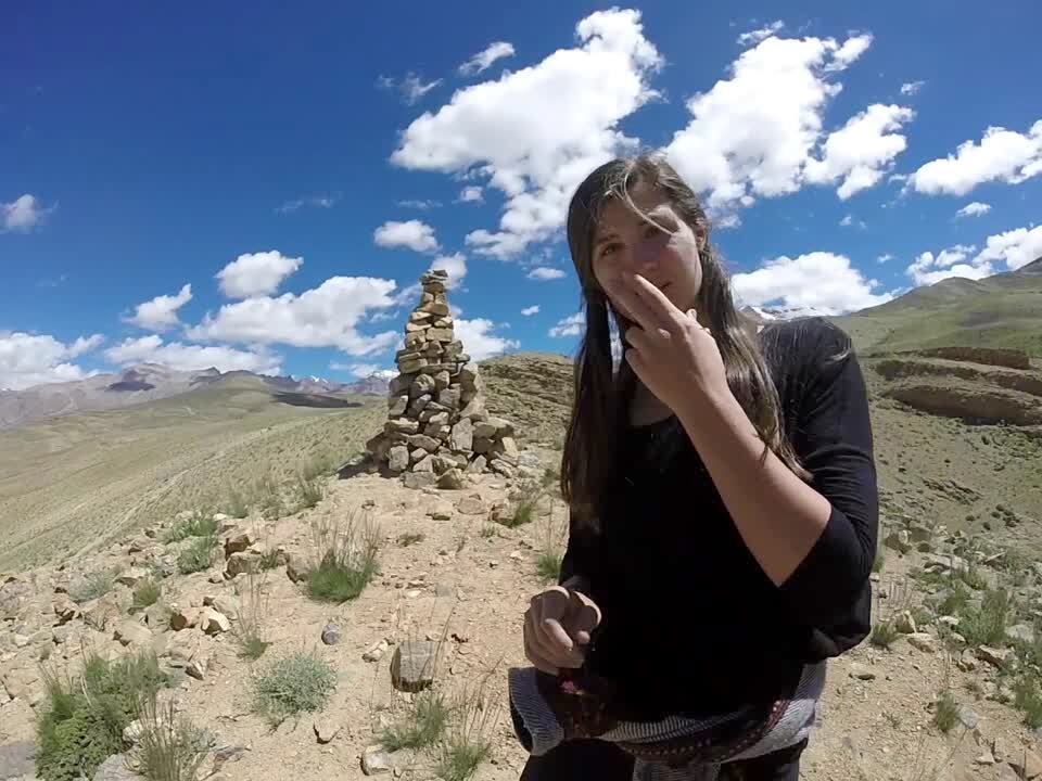 A woman attempts to add a rock to a man-made tower in a Himalayan village. But she loses her balance and it topples over on top of her.