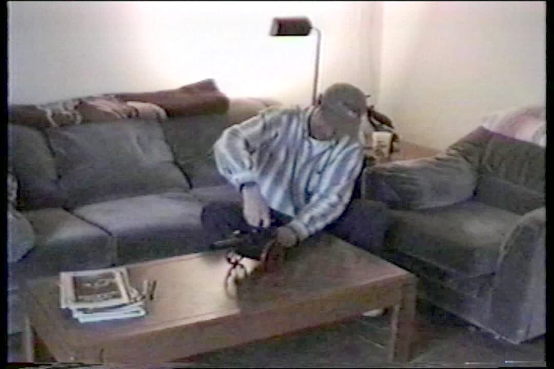 Man fires little cannon in on living room table, pieces from the ceiling fall down. Major setup. Bonehead. .