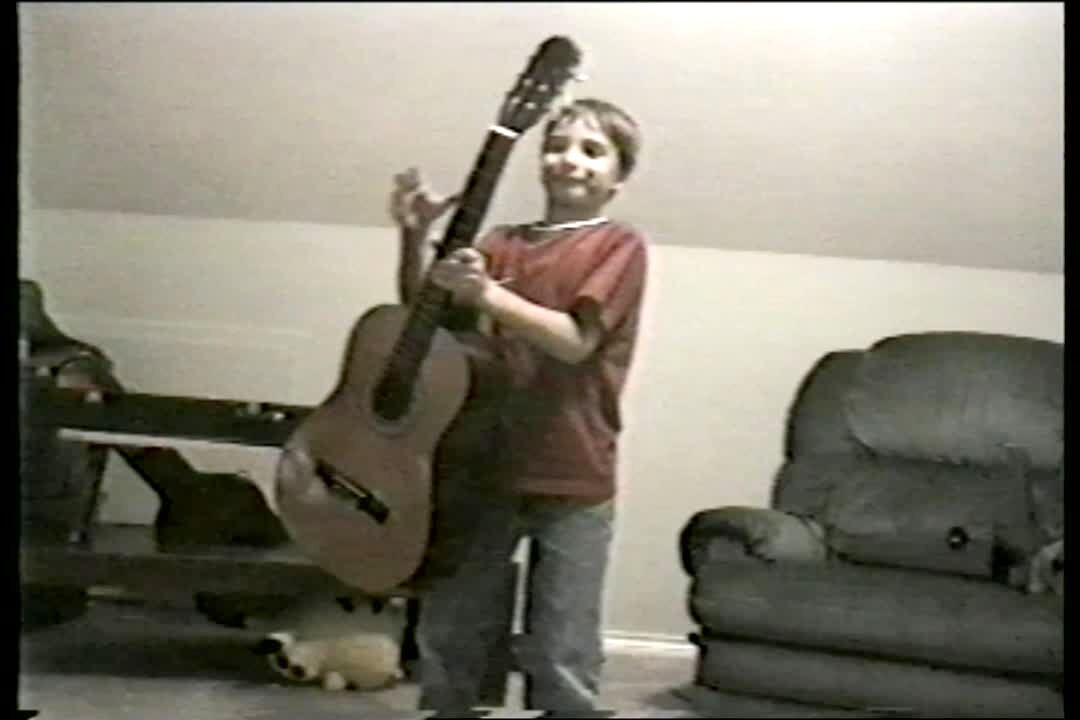 Boy tapes himself goofing around with an acoustic guitar. It breaks in half. he whimpers and yells (off camera) "Mom the guitar broke in half and I was just playing it!" The last part is hard to hear.