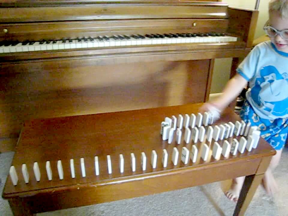 A woman asks a young boy to knock down a row of dominoes on a piano bench. Instead of tipping them over one at a time, he swings his arm and smashes several dominoes down at once. Short heads. Short tails.