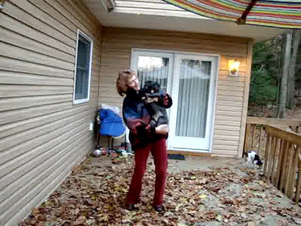 Woman holds pug on porch, she "winds him up" by rubbing dog's butt, then the dog spins in circles and barks in a pile of leaves.
