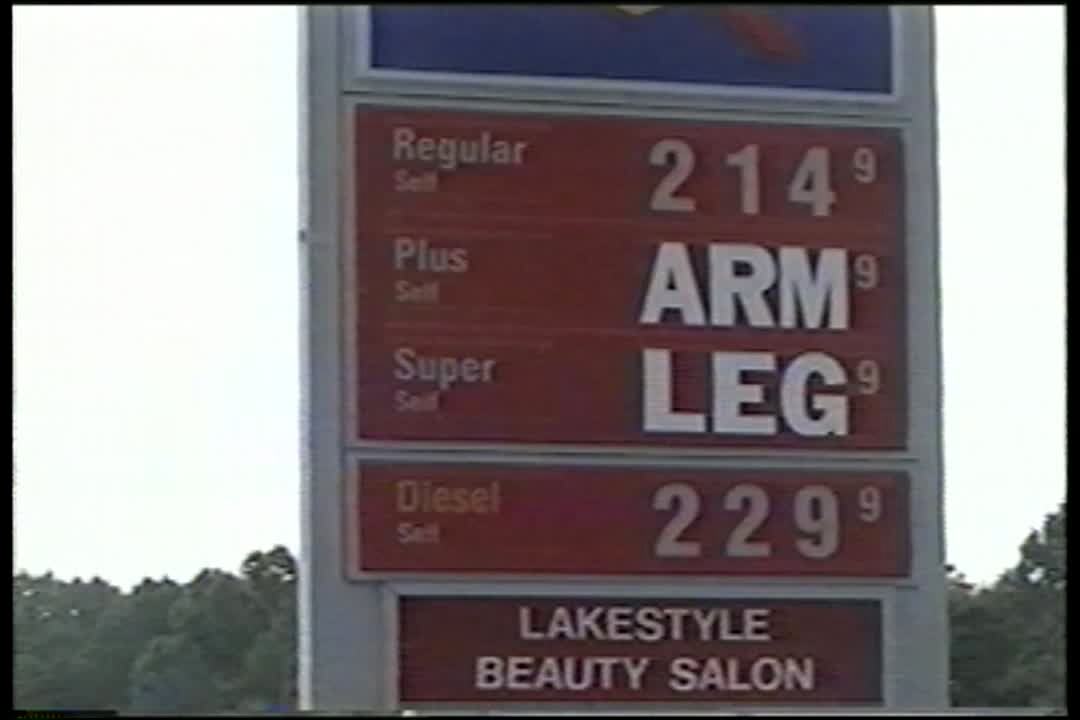 Sign at gas station says the "Super" and the "Super Plus" cost an arm and a leg. Young boy says he got the car filled up and acts like he lost both legs and an arm. Funny Sign