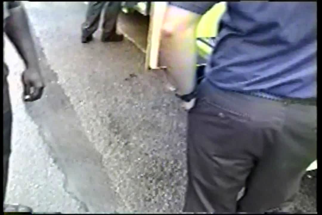 Fire department initiation. Rookie fireman holds onto back of truck for a ride, truck starts forward and a bunch of water dumps on his head.