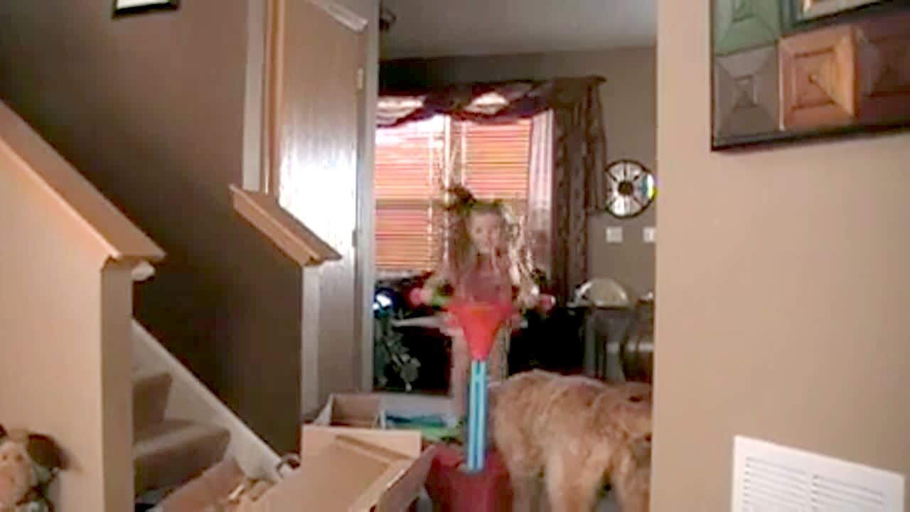 Little girl bounces on a small exercise trampoline with a handlebar indoors. She flips over the front. She's fine.